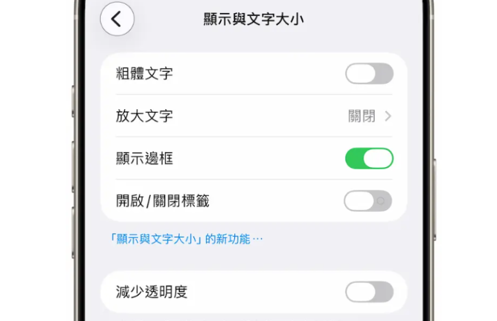 「显示与文字大小」里的「显示边框」被加入,用来在按钮周围加上边框,它取代了先前的「按钮样式」选项,让视觉提示更清楚;
