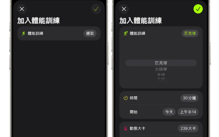 健身 App 的训练现在可以自订,包括选择运动类型、预估卡路里、强度、时间和开始时间这些选项,训练项目的灵活性被增强。