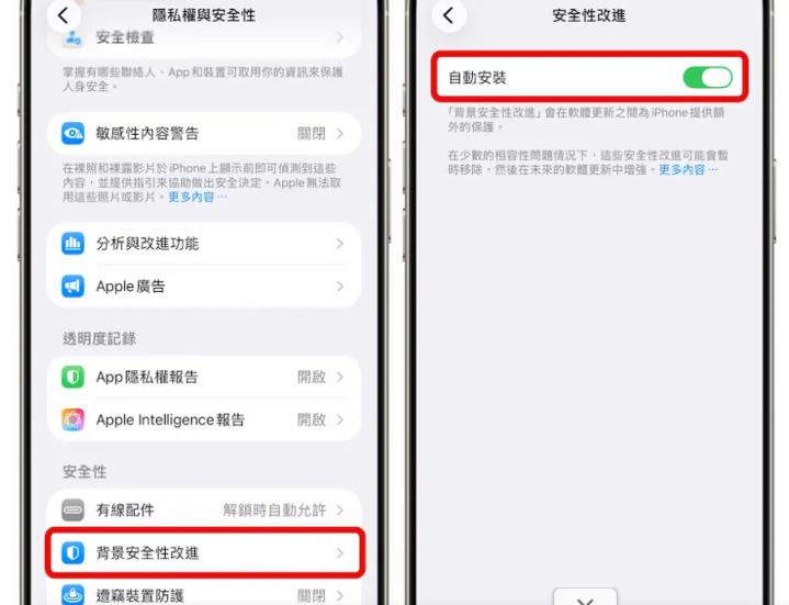 之前升级到 iOS 26 后我们发现快速安全回应的开关不见了,这次它又被放回到「设定」>「隐私权与安全性」,让用户可以选择要不要自动下载或安装安全性更新;