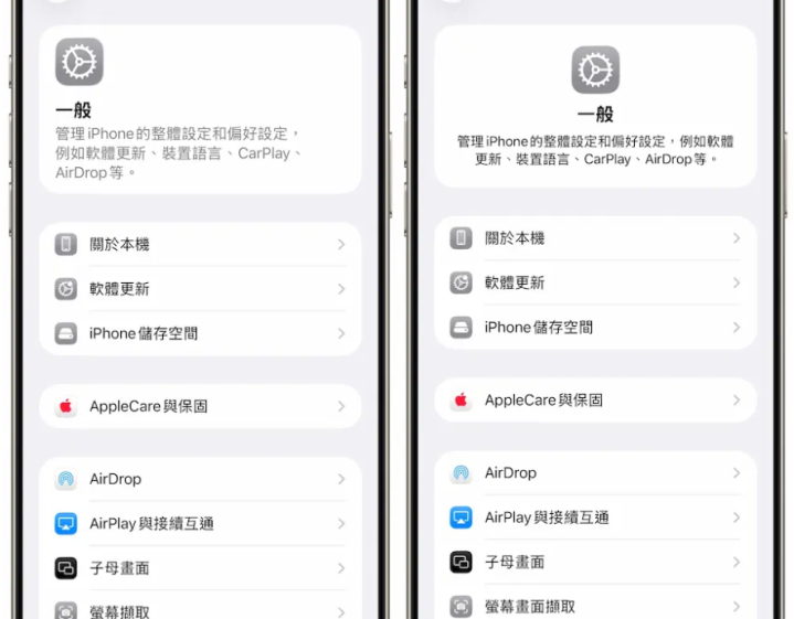 设定里像「一般」、「Wi-Fi」、「蓝牙」、「行动网路」这些页面的标题,原本是置中,现在被改成左对齐,介面看起来跟整体更一致了。